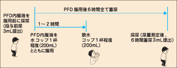 1)PFD内服液を服用する前に採尿してください。(投与前尿3mL提出) 2)PFD内服液を水200mLとともに飲水し,6時間目までの尿を全て蓄尿してください。(6時間蓄尿3mL提出) 3)6時間後に蓄尿時間と蓄尿量を明記し,投与前尿と6時間蓄尿をペアでご提出ください。 *年齢,蓄尿量および小児の場合は服用量を必ず明記してください。